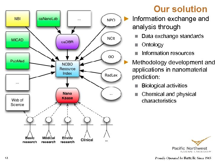 Our solution Information exchange and analysis through Data exchange standards Ontology Information resources Methodology development and applications in nanomaterial prediction: Biological activities Chemical and physical characteristics 13