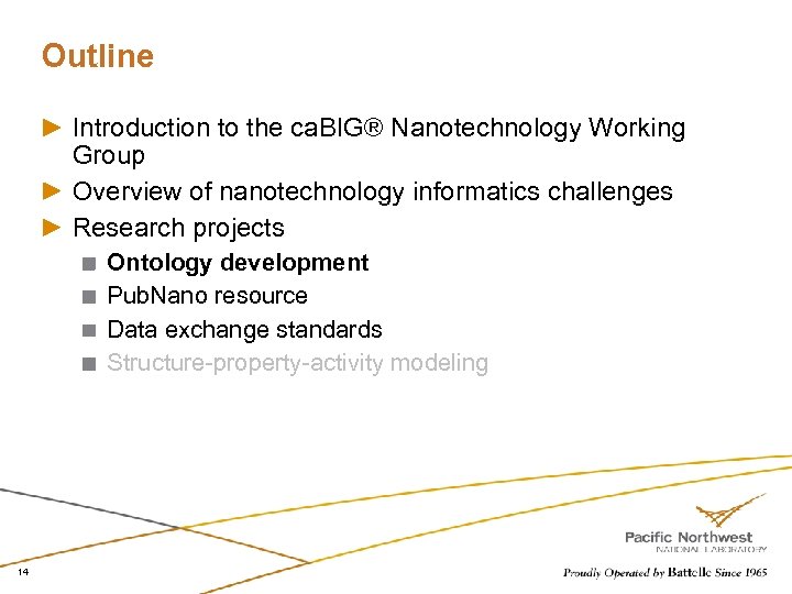 Outline Introduction to the ca. BIG® Nanotechnology Working Group Overview of nanotechnology informatics challenges Research projects Ontology development Pub. Nano resource Data exchange standards Structure-property-activity modeling 14
