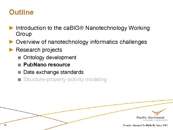 Outline Introduction to the ca. BIG® Nanotechnology Working Group Overview of nanotechnology informatics challenges Research projects Ontology development Pub. Nano resource Data exchange standards Structure-property-activity modeling 18