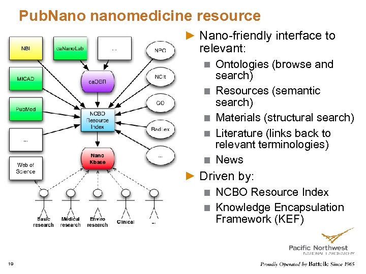 Pub. Nano nanomedicine resource Nano-friendly interface to relevant: Ontologies (browse and search) Resources (semantic search) Materials (structural search) Literature (links back to relevant terminologies) News Driven by: NCBO Resource Index Knowledge Encapsulation Framework (KEF) 19