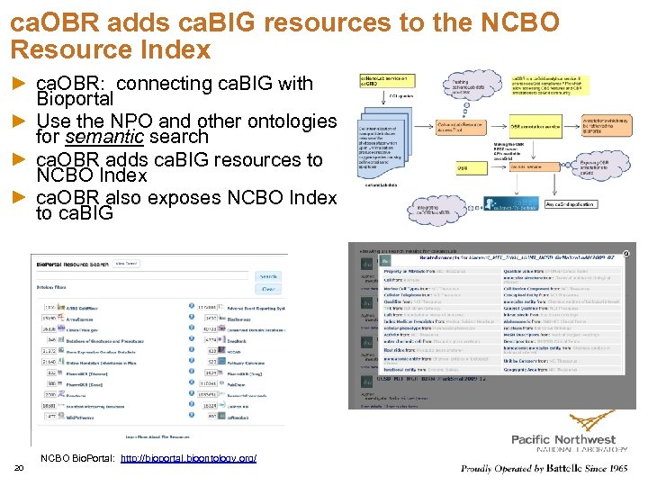 ca. OBR adds ca. BIG resources to the NCBO Resource Index ca. OBR: connecting ca. BIG with Bioportal Use the NPO and other ontologies for semantic search ca. OBR adds ca. BIG resources to NCBO Index ca. OBR also exposes NCBO Index to ca. BIG 20 NCBO Bio. Portal: http: //bioportal. bioontology. org/