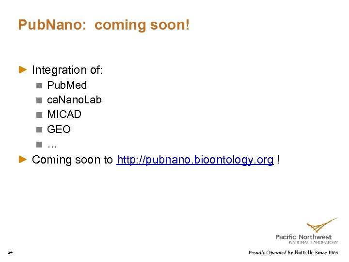 Pub. Nano: coming soon! Integration of: Pub. Med ca. Nano. Lab MICAD GEO … Coming soon to http: //pubnano. bioontology. org ! 24