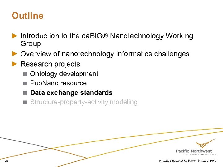 Outline Introduction to the ca. BIG® Nanotechnology Working Group Overview of nanotechnology informatics challenges Research projects Ontology development Pub. Nano resource Data exchange standards Structure-property-activity modeling 25