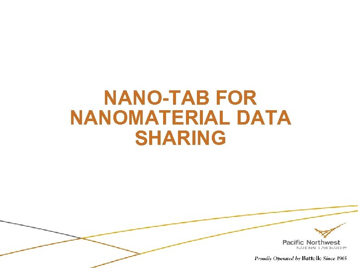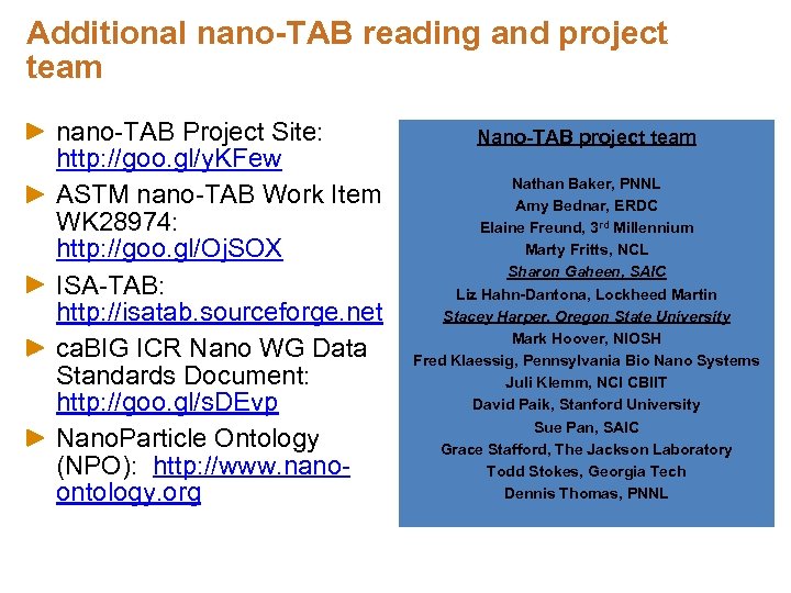 Additional nano-TAB reading and project team nano-TAB Project Site: http: //goo. gl/y. KFew ASTM nano-TAB Work Item WK 28974: http: //goo. gl/Oj. SOX ISA-TAB: http: //isatab. sourceforge. net ca. BIG ICR Nano WG Data Standards Document: http: //goo. gl/s. DEvp Nano. Particle Ontology (NPO): http: //www. nanoontology. org Nano-TAB project team Nathan Baker, PNNL Amy Bednar, ERDC Elaine Freund, 3 rd Millennium Marty Fritts, NCL Sharon Gaheen, SAIC Liz Hahn-Dantona, Lockheed Martin Stacey Harper, Oregon State University Mark Hoover, NIOSH Fred Klaessig, Pennsylvania Bio Nano Systems Juli Klemm, NCI CBIIT David Paik, Stanford University Sue Pan, SAIC Grace Stafford, The Jackson Laboratory Todd Stokes, Georgia Tech Dennis Thomas, PNNL