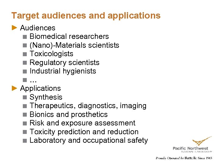 Target audiences and applications Audiences Biomedical researchers (Nano)-Materials scientists Toxicologists Regulatory scientists Industrial hygienists … Applications Synthesis Therapeutics, diagnostics, imaging Bionics and prosthetics Risk and exposure assessment Toxicity prediction and reduction Laboratory and occupational safety