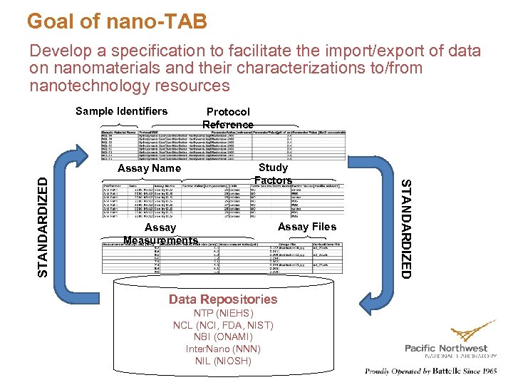 Goal of nano-TAB Develop a specification to facilitate the import/export of data on nanomaterials and their characterizations to/from nanotechnology resources Sample Identifiers Protocol Reference Study Factors Assay Measurements Assay Files Data Repositories NTP (NIEHS) NCL (NCI, FDA, NIST) NBI (ONAMI) Inter. Nano (NNN) NIL (NIOSH) STANDARDIZED Assay Name