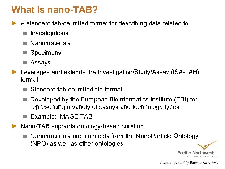 What is nano-TAB? A standard tab-delimited format for describing data related to Investigations Nanomaterials Specimens Assays Leverages and extends the Investigation/Study/Assay (ISA-TAB) format Standard tab-delimited file format Developed by the European Bioinformatics Institute (EBI) for representing a variety of assays and technology types Example: MAGE-TAB Nano-TAB supports ontology-based curation Nanomaterials and concepts from the Nano. Particle Ontology (NPO) as well as other ontologies