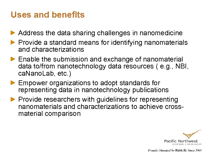 Uses and benefits Address the data sharing challenges in nanomedicine Provide a standard means for identifying nanomaterials and characterizations Enable the submission and exchange of nanomaterial data to/from nanotechnology data resources ( e. g. , NBI, ca. Nano. Lab, etc. ) Empower organizations to adopt standards for representing data in nanotechnology publications Provide researchers with guidelines for representing nanomaterials and characterizations to achieve crossmaterial comparison
