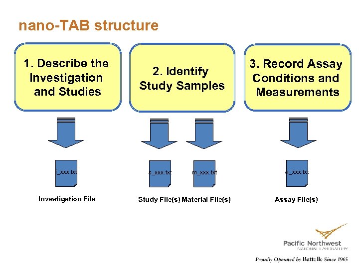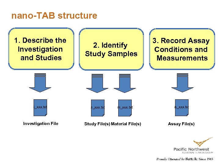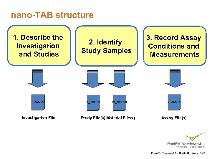nano-TAB structure 1. Describe the Investigation and Studies i_xxx. txt Investigation File 2. Identify Study Samples s_xxx. txt m_xxx. txt Study File(s) Material File(s) 3. Record Assay Conditions and Measurements a_xxx. txt Assay File(s)