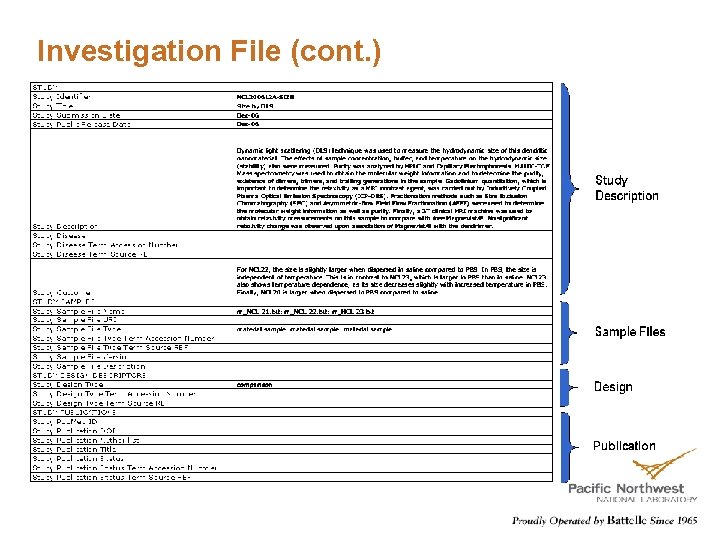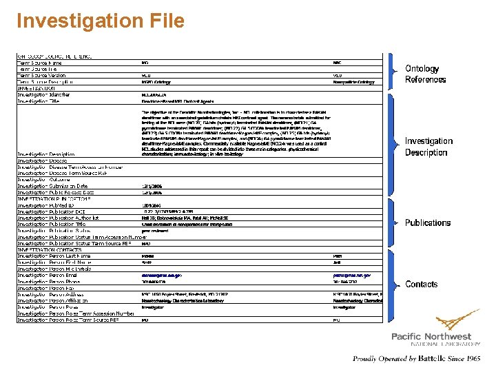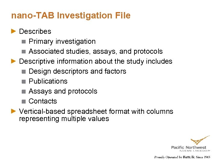nano-TAB Investigation File Describes Primary investigation Associated studies, assays, and protocols Descriptive information about the study includes Design descriptors and factors Publications Assays and protocols Contacts Vertical-based spreadsheet format with columns representing multiple values