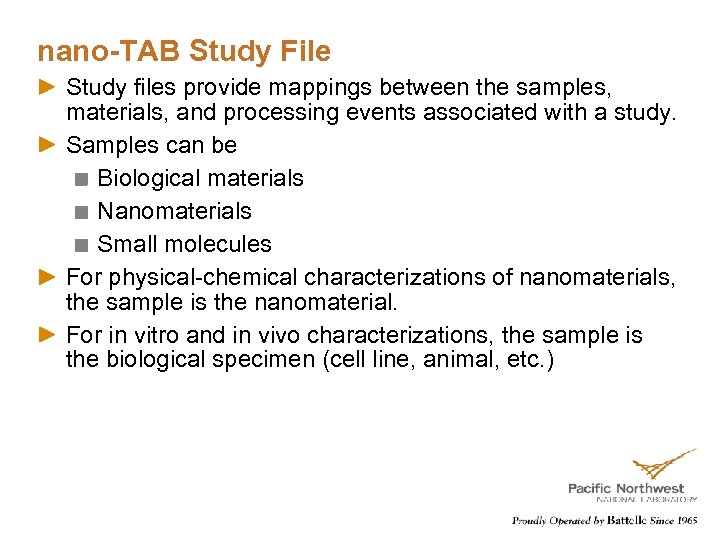 nano-TAB Study File Study files provide mappings between the samples, materials, and processing events associated with a study. Samples can be Biological materials Nanomaterials Small molecules For physical-chemical characterizations of nanomaterials, the sample is the nanomaterial. For in vitro and in vivo characterizations, the sample is the biological specimen (cell line, animal, etc. )
