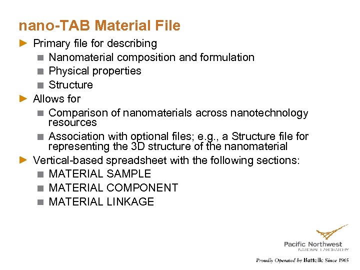 nano-TAB Material File Primary file for describing Nanomaterial composition and formulation Physical properties Structure Allows for Comparison of nanomaterials across nanotechnology resources Association with optional files; e. g. , a Structure file for representing the 3 D structure of the nanomaterial Vertical-based spreadsheet with the following sections: MATERIAL SAMPLE MATERIAL COMPONENT MATERIAL LINKAGE