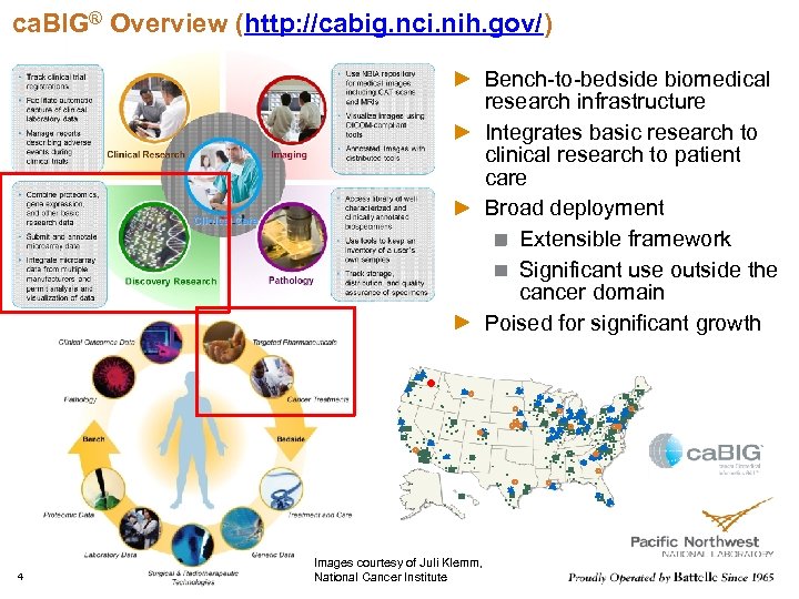 ca. BIG® Overview (http: //cabig. nci. nih. gov/) Bench-to-bedside biomedical research infrastructure Integrates basic research to clinical research to patient care Broad deployment Extensible framework Significant use outside the cancer domain Poised for significant growth • 4 Images courtesy of Juli Klemm, National Cancer Institute