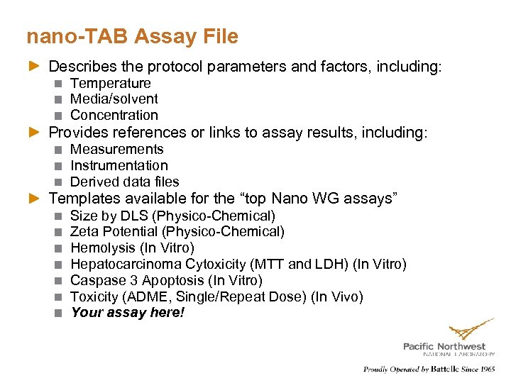 nano-TAB Assay File Describes the protocol parameters and factors, including: Temperature Media/solvent Concentration Provides references or links to assay results, including: Measurements Instrumentation Derived data files Templates available for the “top Nano WG assays” Size by DLS (Physico-Chemical) Zeta Potential (Physico-Chemical) Hemolysis (In Vitro) Hepatocarcinoma Cytoxicity (MTT and LDH) (In Vitro) Caspase 3 Apoptosis (In Vitro) Toxicity (ADME, Single/Repeat Dose) (In Vivo) Your assay here!