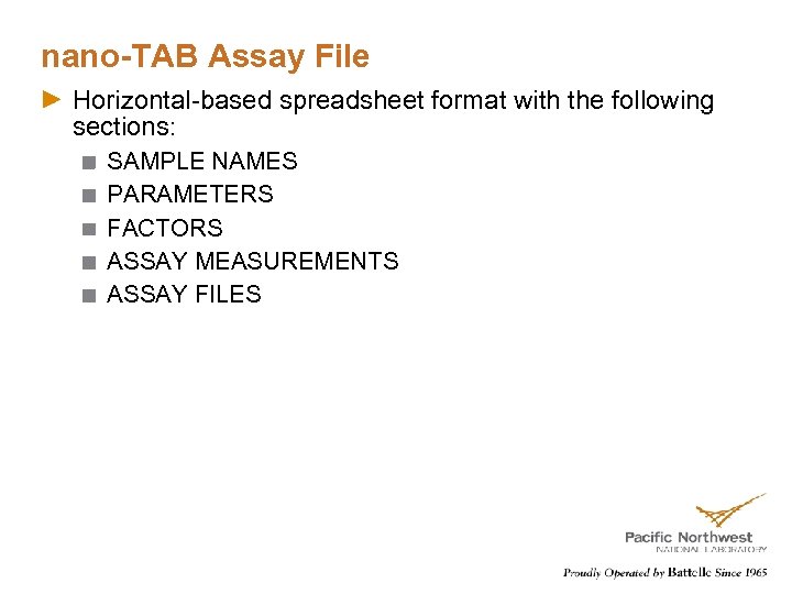 nano-TAB Assay File Horizontal-based spreadsheet format with the following sections: SAMPLE NAMES PARAMETERS FACTORS ASSAY MEASUREMENTS ASSAY FILES
