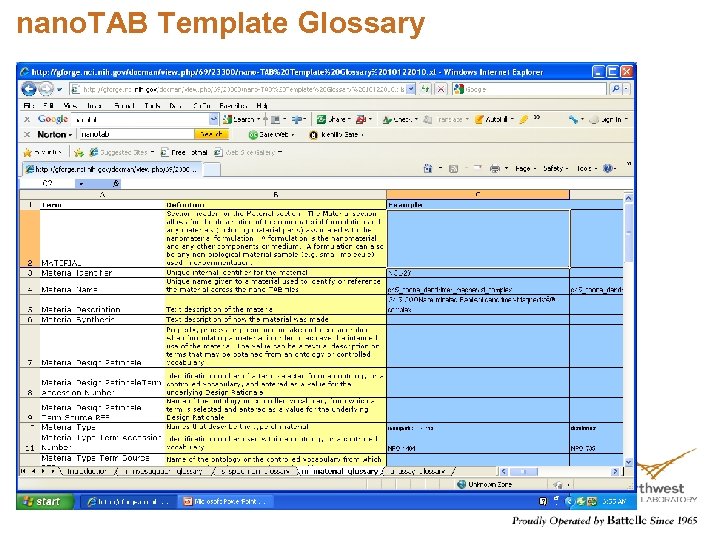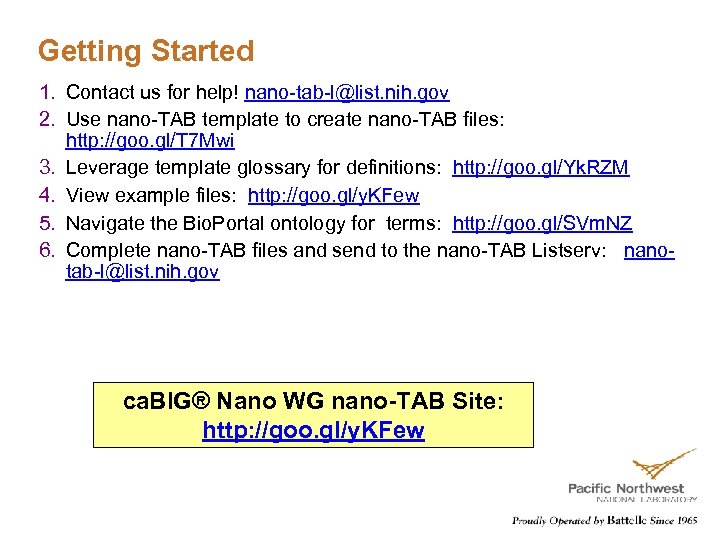Getting Started 1. Contact us for help! nano-tab-l@list. nih. gov 2. Use nano-TAB template to create nano-TAB files: http: //goo. gl/T 7 Mwi 3. Leverage template glossary for definitions: http: //goo. gl/Yk. RZM 4. View example files: http: //goo. gl/y. KFew 5. Navigate the Bio. Portal ontology for terms: http: //goo. gl/SVm. NZ 6. Complete nano-TAB files and send to the nano-TAB Listserv: nanotab-l@list. nih. gov ca. BIG® Nano WG nano-TAB Site: http: //goo. gl/y. KFew