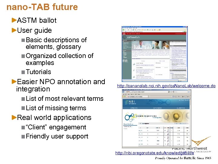 nano-TAB future ASTM ballot User guide Basic descriptions of elements, glossary Organized collection of examples Tutorials Easier NPO annotation and integration http: //cananolab. nci. nih. gov/ca. Nano. Lab/welcome. do List of most relevant terms List of missing terms Real world applications “Client” engagement Friendly user support http: //nbi. oregonstate. edu/knowledgebase