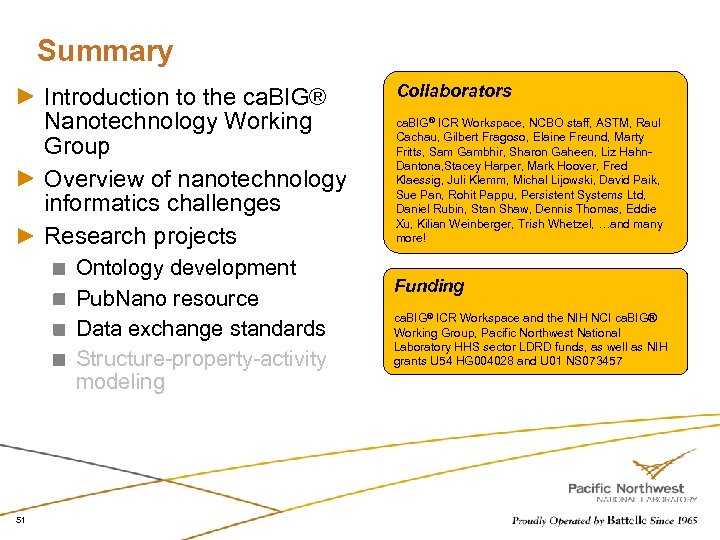 Summary Introduction to the ca. BIG® Nanotechnology Working Group Overview of nanotechnology informatics challenges Research projects Ontology development Pub. Nano resource Data exchange standards Structure-property-activity modeling 51 Collaborators ca. BIG® ICR Workspace, NCBO staff, ASTM, Raul Cachau, Gilbert Fragoso, Elaine Freund, Marty Fritts, Sam Gambhir, Sharon Gaheen, Liz Hahn. Dantona, Stacey Harper, Mark Hoover, Fred Klaessig, Juli Klemm, Michal Lijowski, David Paik, Sue Pan, Rohit Pappu, Persistent Systems Ltd, Daniel Rubin, Stan Shaw, Dennis Thomas, Eddie Xu, Kilian Weinberger, Trish Whetzel, …and many more! Funding ca. BIG® ICR Workspace and the NIH NCI ca. BIG® Working Group, Pacific Northwest National Laboratory HHS sector LDRD funds, as well as NIH grants U 54 HG 004028 and U 01 NS 073457