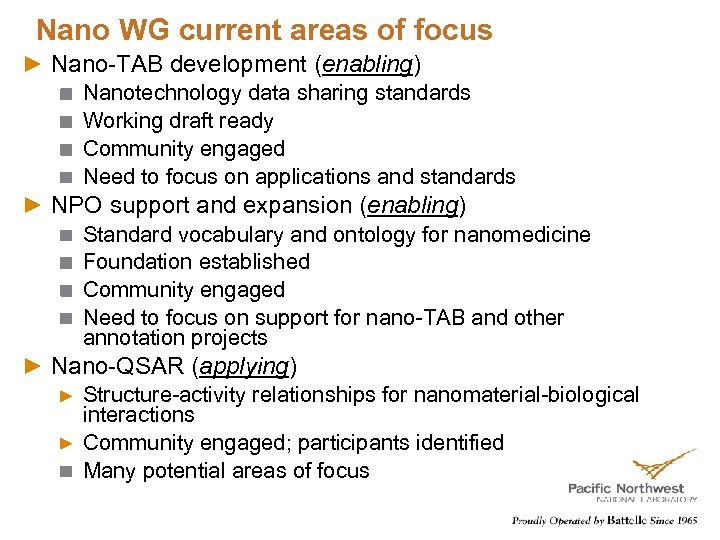 Nano WG current areas of focus Nano-TAB development (enabling) Nanotechnology data sharing standards Working draft ready Community engaged Need to focus on applications and standards NPO support and expansion (enabling) Standard vocabulary and ontology for nanomedicine Foundation established Community engaged Need to focus on support for nano-TAB and other annotation projects Nano-QSAR (applying) Structure-activity relationships for nanomaterial-biological interactions Community engaged; participants identified Many potential areas of focus