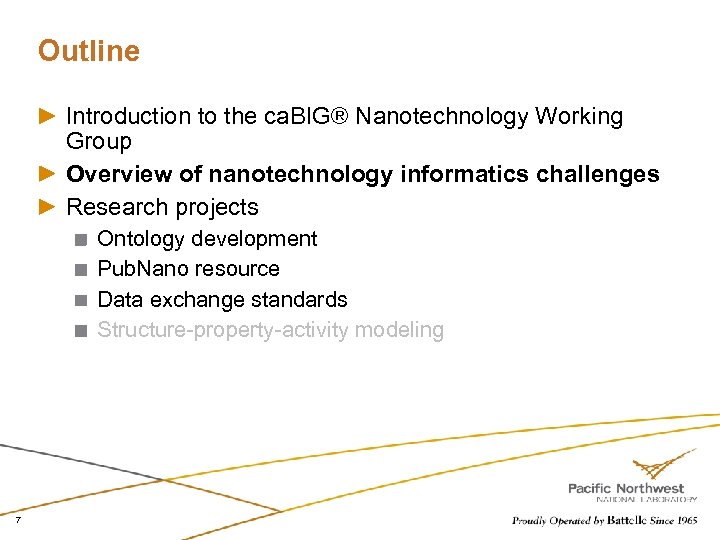 Outline Introduction to the ca. BIG® Nanotechnology Working Group Overview of nanotechnology informatics challenges Research projects Ontology development Pub. Nano resource Data exchange standards Structure-property-activity modeling 2