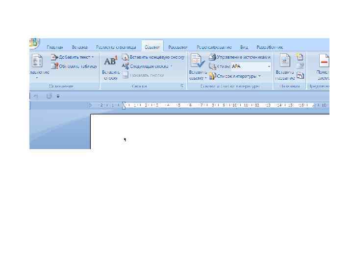 Сноски • • Сноски являются необходимым атрибутом больших документов разных типов. Особенно они актуальны при написании различных научных работ – от рефератов до дипломных проектов и научных статей. В Word есть возможность автоматического создания сносок. Основная особенность такого способа состоит в том, что программа автоматически размещает сноску внизу страницы, выбирает для нее подходящий размер шрифта и сохраняет нумерацию, если в документе впоследствии происходят какие-нибудь изменения. Сноска состоит из двух частей: текста и ссылки в виде числа возле соответствующего слова документа. В зависимости от того, где помещается текст, сноски могут быть двух типов: – обычные – текст помещается на той же странице, что и ссылка; – концевые – текст расположен в конце документа, главы и т. д.