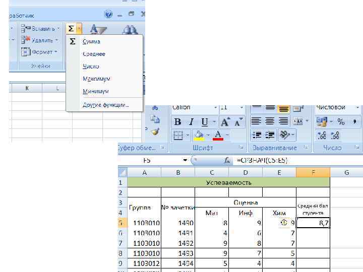 Использование автозавершения ü Если несколько первых символов, вводимых в ячейку, совпадают с символами записи, ранее введенной в этом столбце, то эта запись при вводе отображается в ячейке и недостающая часть записи может быть введена автоматически. Для этого достаточно нажать клавишу Enter. ü Если же необходимо ввести другую информацию, то следует продолжать ввод данных. Автоматический ввод производится только для записей, которые содержат текст или текст в сочетании с числами. Записи, полностью состоящие из чисел, дат или времени, необходимо вводить самостоятельно. ü Удобно при наборе встроенных функций и больших формул.