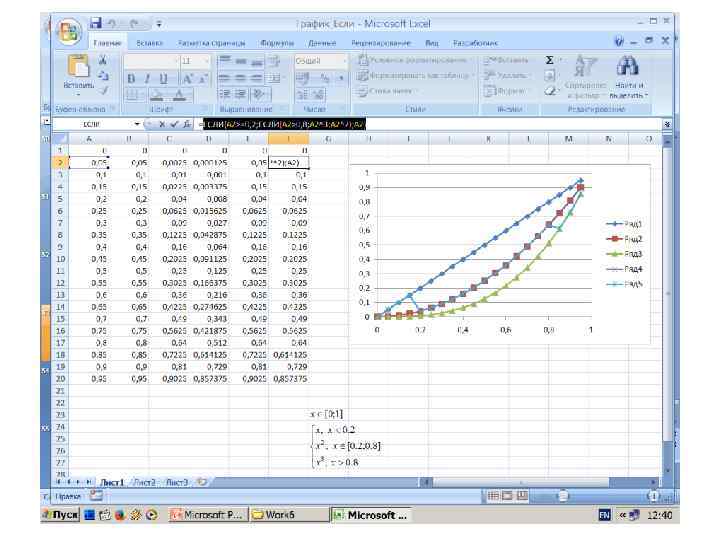 Построение графиков с использование логической функции ЕСЛИ(лог_выражение; значение_если_истина ; значение_если_ложь) =ЕСЛИ(A 2>=0, 2; ЕСЛИ(A 2>0, 8; A 2^3; A 2^2); A 2) Возможны другие варианты =ЕСЛИ(И(A 1<0, 2; A 1; ЕСЛИ(И(A 1>=0, 2; A 1<=0, 8), A 1^2; A 1^3) =ЕСЛИ(И(A 1>0, 8; A 1^3; ЕСЛИ(A 1>=0, 2, A 1^2; A 1)