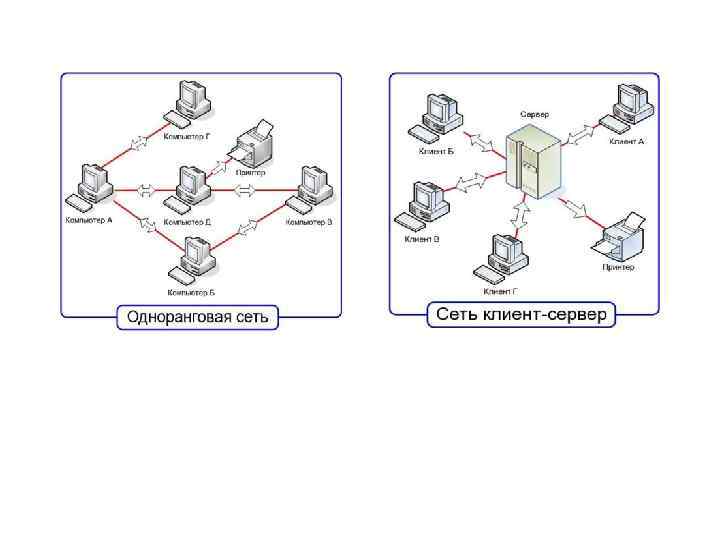 Архитектура сети Архитектура – это концепция, определяющая взаимосвязь, структуру и функции взаимодействия рабочих станций в сети. Она предусматривает логическую, функциональную и физическую организацию технических и программных средств сети. Архитектура определяет принципы построения и функционирования аппаратного и программного обеспечения элементов сети. Основные типы архитектуры сети: терминал – главный компьютер; одноранговая архитектура; архитектура клиент – сервер.