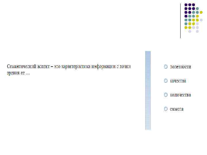 Семантический аспект – характеристика информации с точки зрения ее смысла. Для разумного существа информация – нематериальный смысл, извлекаемый из сообщения на основе накопленных знаний. Одно и то же сообщение может иметь различное представление, например, написано на разных языках. Переход от представления к значению (смыслу) сообщения называется интерпретацией. Для осмысленного использования информации необходимо знание правил интерпретации сообщений - используемого языка или способа кодирования.