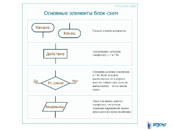 Язык блок-схем прост (хотя существуют его расширенные варианты): • Прямоугольник – выполнение действия (например, c = a + b) • Ромб – проверка условия (например, a > b). Если условие выполняется, то алгоритм идет по линии «да» , если не выполняется – то по линии «нет» . • Скругленный прямоугольник – начало и конец алгоритма • Скошенный прямоугольник – ввод-вывод данных (например, получение значения переменной, вывод результата на экран монитора).