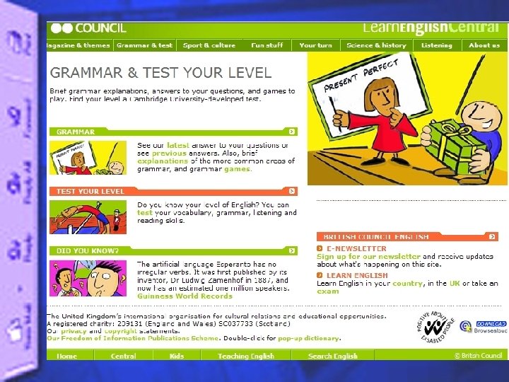 engleski jezik najčešće učen strani jezik u školskom i akademskom obrazovanju preporučamo jedan od online alata: ü http: //www. learnenglish. org. uk * ü odabire se nivo znanja i učenja (za odrasle, djecu, kao pomoć nastavnicima, poslovni itd. ) odabir odgovarajućeg alata iziskuje malo vremena i truda → ponuda na Internetu svakim danom raste i za svako područje moguće je pronaći traženi materijal