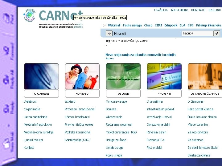CARNet Hrvatska akademska i istraživačka mreža (Croatian Academic and Research Network) stvaranje, uvođenje i uporaba novih tehnologija namijenjenih učenicima, nastavnicima, studentima i znanstvenicima besplatne usluge → potreban AAI@ identitet