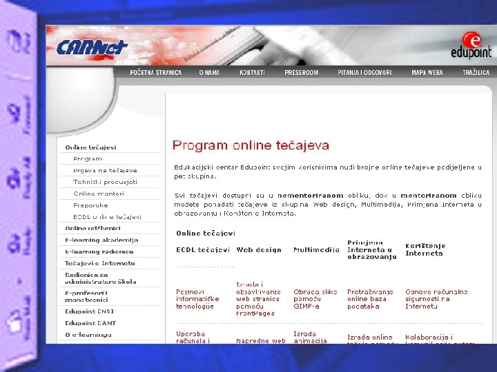 ONLINE TEČAJEVI EDUPOINT program sadrži pet područja: ü ü ü ECDL tečajevi Web dizajn Multimedija Primjena Interneta u obrazovanju Korištenje Interneta nementorirani online tečajevi → namijenjeni učenicima i profesorima mentorirani online tečajevi → namijenjeni samo profesorima