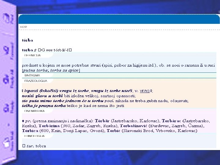 HRVATSKI JEZIČNI PORTAL* zajednički projekt Novog Libera i Srca sadrži 116. 516 osnovnih riječi (natuknica) riječi opisane definicijama, sintagmama, frazeologijom, onomastikom i etimologijom povijest hrvatskoga jezika
