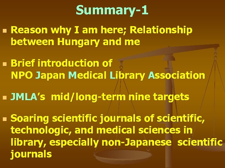 Summary-1 n n Reason why I am here; Relationship between Hungary and me Brief introduction of NPO Japan Medical Library Association JMLA’s mid/long-term nine targets Soaring scientific journals of scientific, technologic, and medical sciences in library, especially non-Japanese scientific journals