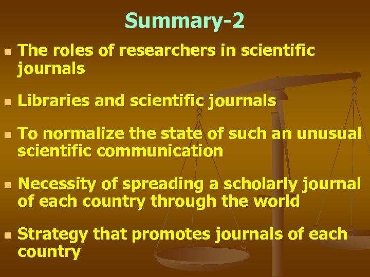 Summary-2 n n n The roles of researchers in scientific journals Libraries and scientific journals To normalize the state of such an unusual scientific communication Necessity of spreading a scholarly journal of each country through the world Strategy that promotes journals of each country