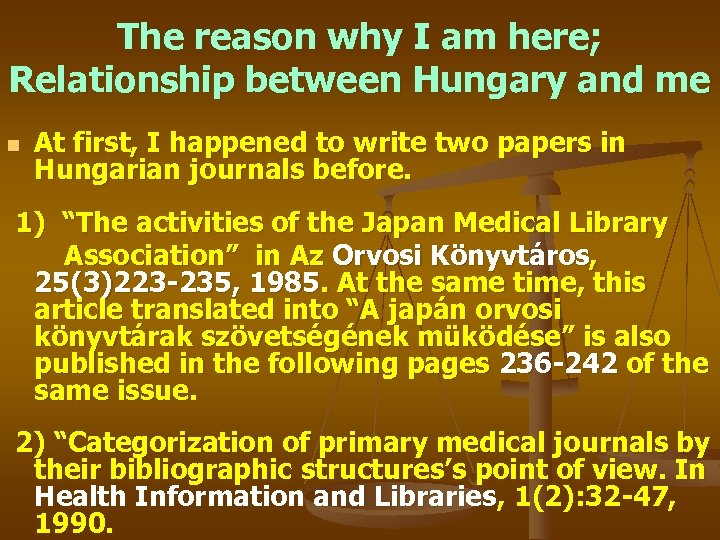 The reason why I am here; Relationship between Hungary and me n At first, I happened to write two papers in Hungarian journals before. 1) “The activities of the Japan Medical Library Association” in Az Orvosi Könyvtáros, 25(3)223 -235, 1985. At the same time, this article translated into “A japán orvosi könyvtárak szövetségének müködése” is also published in the following pages 236 -242 of the same issue. 2) “Categorization of primary medical journals by their bibliographic structures’s point of view. In Health Information and Libraries, 1(2): 32 -47, 1990.