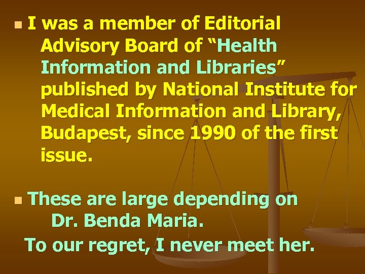 I was a member of Editorial Advisory Board of “Health Information and Libraries” published by National Institute for Medical Information and Library, Budapest, since 1990 of the first issue. n These are large depending on Dr. Benda Maria. To our regret, I never meet her. n