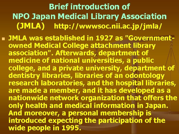Brief introduction of NPO Japan Medical Library Association (JMLA) http: //wwwsoc. nii. ac. jp/jmla/ n JMLA was established in 1927 as "Governmentowned Medical College attachment library association". Afterwards, department of medicine of national universities, a public college, and a private university, department of dentistry libraries, libraries of an odontology research laboratories, and the hospital libraries, are made a member, and it has developed as a nationwide network organization that offers the only health and medical information in Japan. And moreover, a personal membership is introduced expecting the participation of the wide people in 1995.