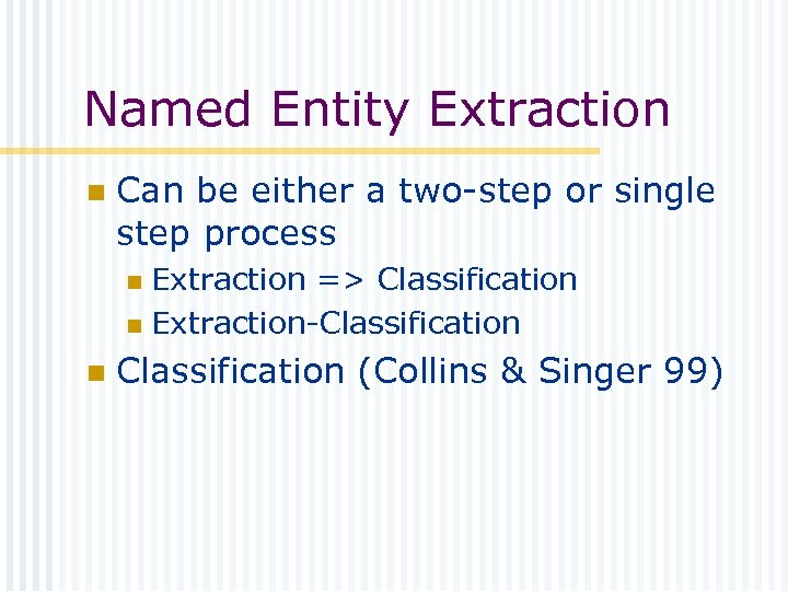 Named Entity Extraction n Can be either a two-step or single step process Extraction => Classification n Extraction-Classification n n Classification (Collins & Singer 99)