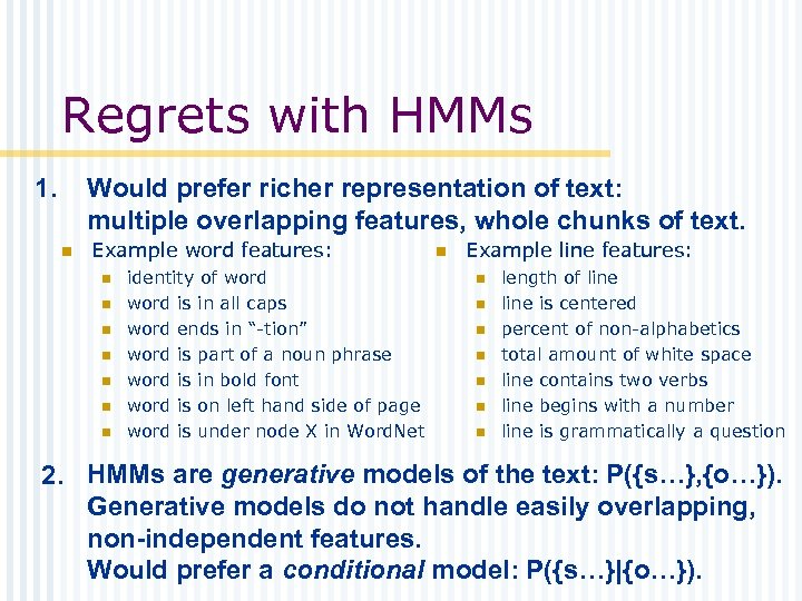 Regrets with HMMs Would prefer richer representation of text: multiple overlapping features, whole chunks of text. 1. n Example word features: n n n n identity of word is in all caps word ends in “-tion” word is part of a noun phrase word is in bold font word is on left hand side of page word is under node X in Word. Net n Example line features: n n n n length of line is centered percent of non-alphabetics total amount of white space line contains two verbs line begins with a number line is grammatically a question 2. HMMs are generative models of the text: P({s…}, {o…}). Generative models do not handle easily overlapping, non-independent features. Would prefer a conditional model: P({s…}|{o…}).