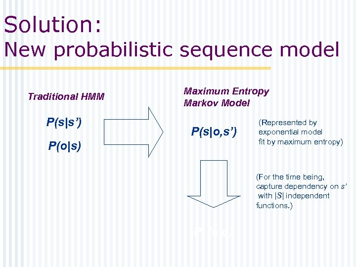 Solution: New probabilistic sequence model Traditional HMM P(s|s’) Maximum Entropy Markov Model P(s|o, s’) P(o|s) (Represented by exponential model fit by maximum entropy) (For the time being, capture dependency on s’ with |S| independent functions. ) Ps’(s|o)