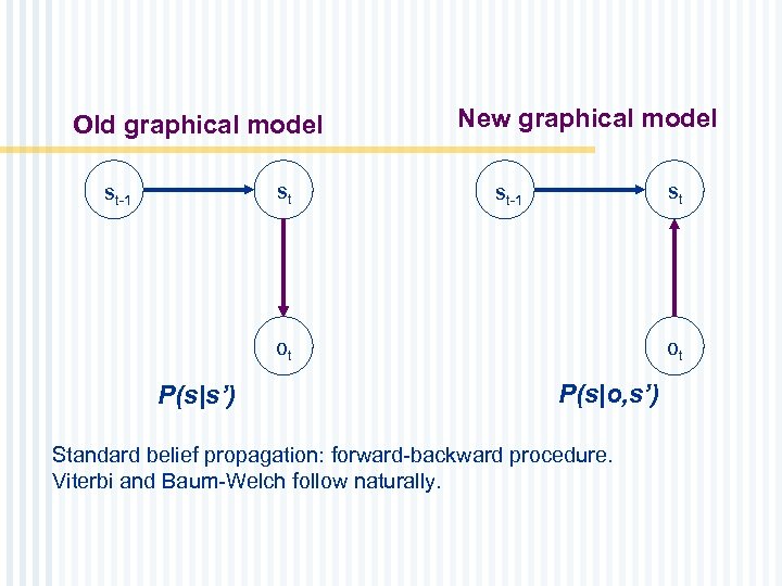 Old graphical model st st-1 New graphical model st st-1 ot P(s|s’) P(o|s) ot P(s|o, s’) Standard belief propagation: forward-backward procedure. Viterbi and Baum-Welch follow naturally.