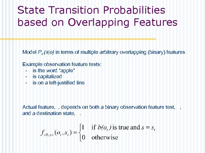 State Transition Probabilities based on Overlapping Features Model Ps’(s|o) in terms of multiple arbitrary overlapping (binary) features. Example observation feature tests: - o is the word “apple” - o is capitalized - o is on a left-justified line Actual feature, f, depends on both a binary observation feature test, b, and a destination state, s.