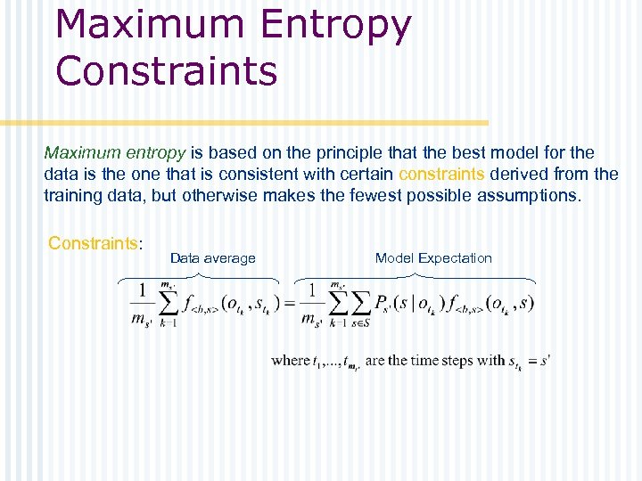 Maximum Entropy Constraints Maximum entropy is based on the principle that the best model for the data is the one that is consistent with certain constraints derived from the training data, but otherwise makes the fewest possible assumptions. Constraints: Data average Model Expectation