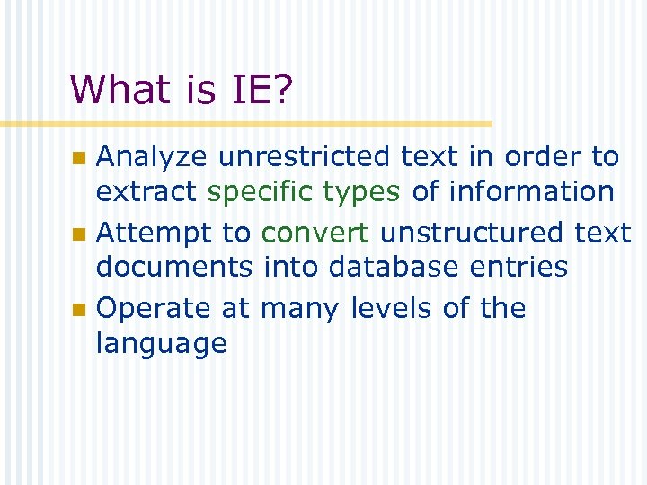 What is IE? Analyze unrestricted text in order to extract specific types of information n Attempt to convert unstructured text documents into database entries n Operate at many levels of the language n