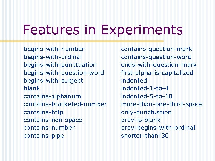 Features in Experiments begins-with-number begins-with-ordinal begins-with-punctuation begins-with-question-word begins-with-subject blank contains-alphanum contains-bracketed-number contains-http contains-non-space contains-number contains-pipe contains-question-mark contains-question-word ends-with-question-mark first-alpha-is-capitalized indented-1 -to-4 indented-5 -to-10 more-than-one-third-space only-punctuation prev-is-blank prev-begins-with-ordinal shorter-than-30