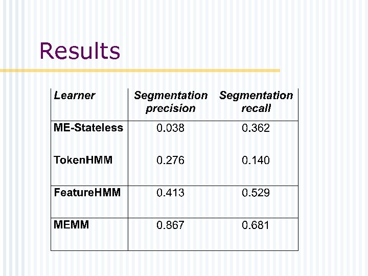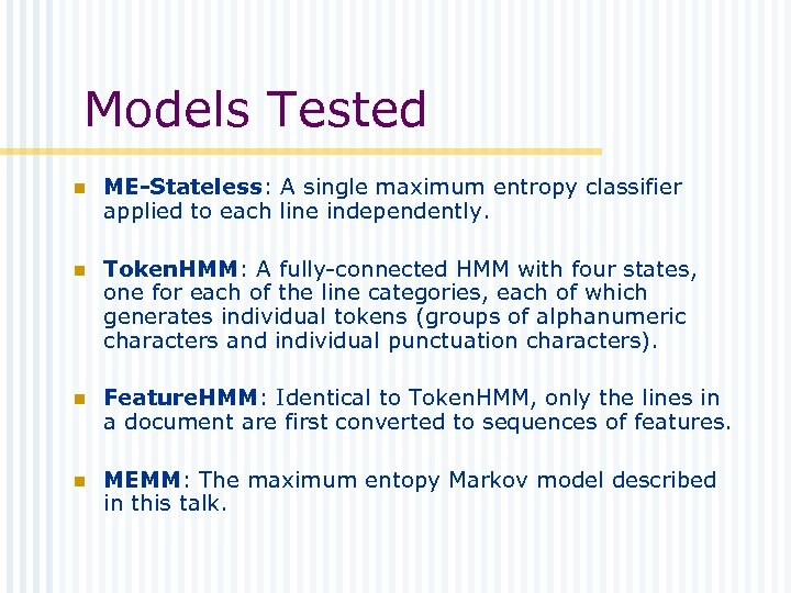 Models Tested n ME-Stateless: A single maximum entropy classifier applied to each line independently. n Token. HMM: A fully-connected HMM with four states, one for each of the line categories, each of which generates individual tokens (groups of alphanumeric characters and individual punctuation characters). n Feature. HMM: Identical to Token. HMM, only the lines in a document are first converted to sequences of features. n MEMM: The maximum entopy Markov model described in this talk.