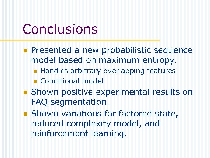 Conclusions n Presented a new probabilistic sequence model based on maximum entropy. n n Handles arbitrary overlapping features Conditional model Shown positive experimental results on FAQ segmentation. Shown variations for factored state, reduced complexity model, and reinforcement learning.