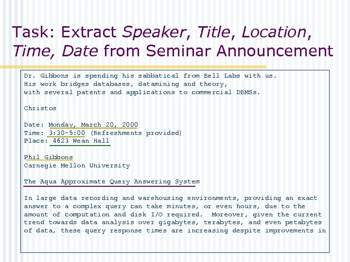 Task: Extract Speaker, Title, Location, Time, Date from Seminar Announcement Dr. Gibbons is spending his sabbatical from Bell Labs with us. His work bridges databases, datamining and theory, with several patents and applications to commercial DBMSs. Christos Date: Monday, March 20, 2000 Time: 3: 30 -5: 00 (Refreshments provided) Place: 4623 Wean Hall Phil Gibbons Carnegie Mellon University The Aqua Approximate Query Answering System In large data recording and warehousing environments, providing an exact answer to a complex query can take minutes, or even hours, due to the amount of computation and disk I/O required. Moreover, given the current trend towards data analysis over gigabytes, terabytes, and even petabytes of data, these query response times are increasing despite improvements in